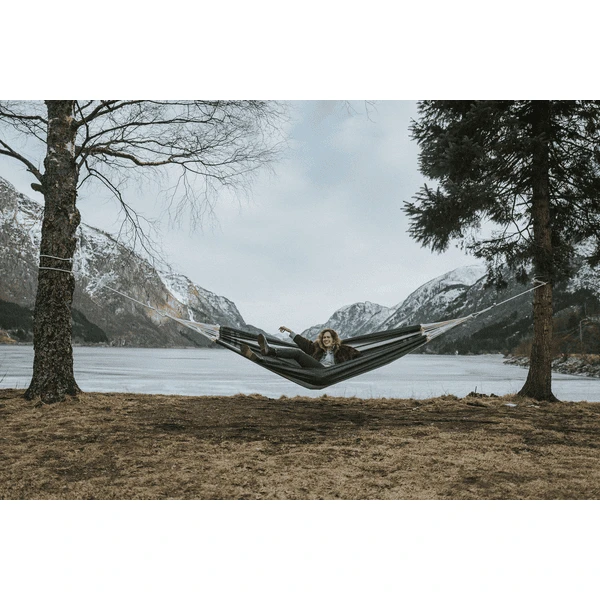 - Il tessuto denso da 400 g/m2 con una capacità di carico massima di 200 kg garantisce la durata dell’amaca