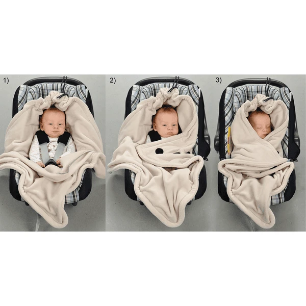 Per brevi distanze si può semplicemente e comodamente avvolgere il bebè nella coperta, senza uso di giacche. Le pratiche fessure per cinture consentono di fissare il bambino in modo sicuro e confortevole nella coperta in pile nel seggiolino auto.