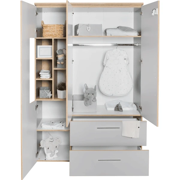 L’armadio a 3 ante, grigio chiaro con cerniere, ha un pannello superiore fluttuante in decorazione “quercia dorata” come un’altra caratteristica speciale Design -High light . Grazie alla sua altezza di 2 m, l’armadio cresce con te fino all’età adulta e può essere utilizzato anche come armadio per la camera dei giovani. L’elegante armadio a 3 ante può essere perfettamente ampliato con altri mobili per neonati e bambini della serie “Tobi” per creare una camera per neonati o bambini completamente arredata con mobili di sistema che crescono con il bambino.
