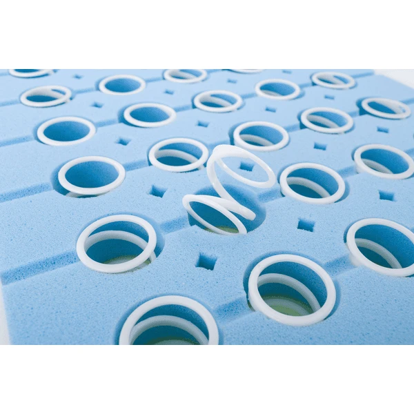 A differenza della schiuma morbida, le schiume a freddo utilizzano materie prime di qualità superiore. La schiuma a freddo mostra un migliore comportamento elastico, è più traspirante e ha una durata di vita più lunga. L’integrazione di condotti dell’aria e tagli di contorno migliora in modo decisivo fattori importanti come la ventilazione e l’elasticità. - Molle in plastica